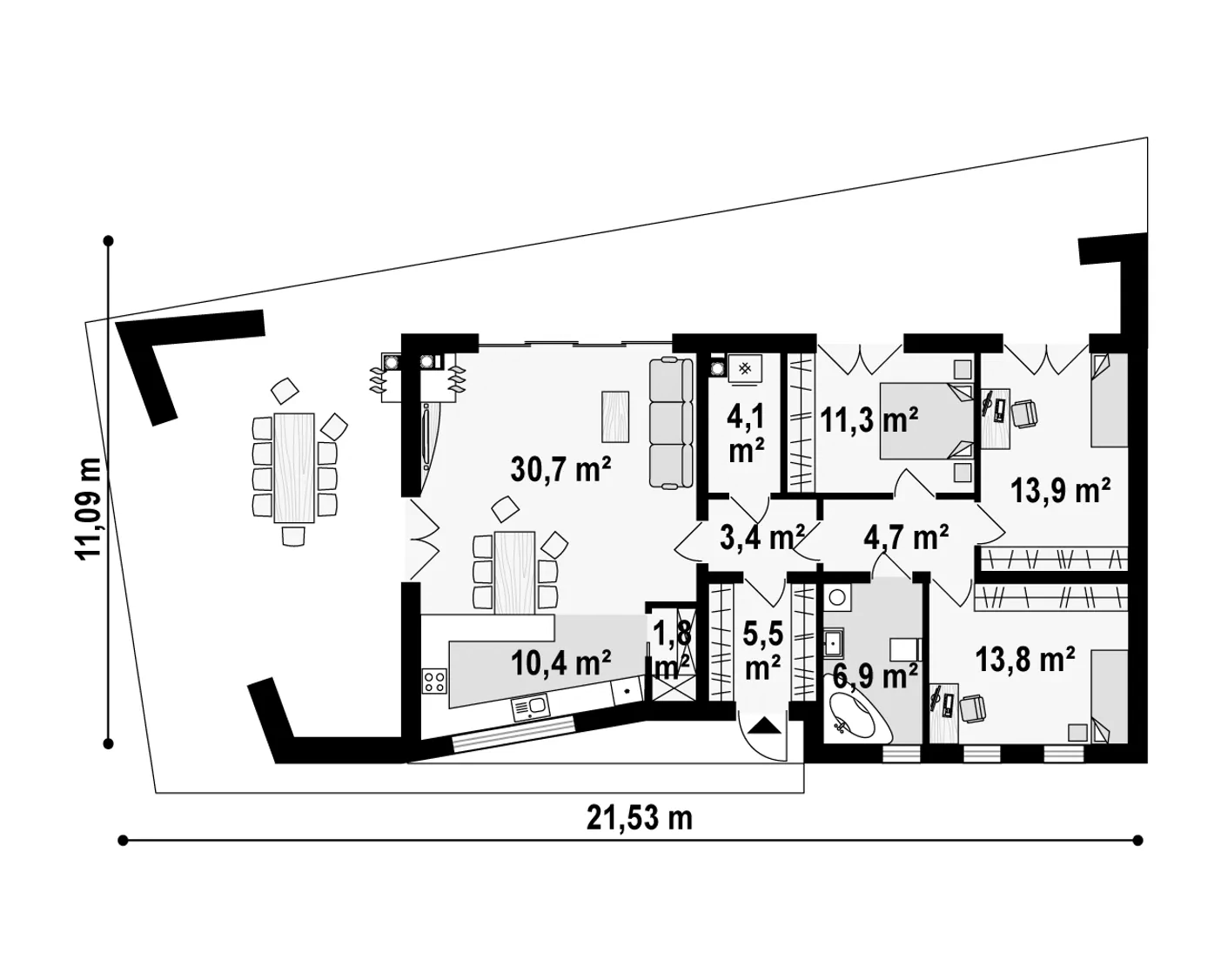 Maja mõõtmed 21.53 x 11.09 m