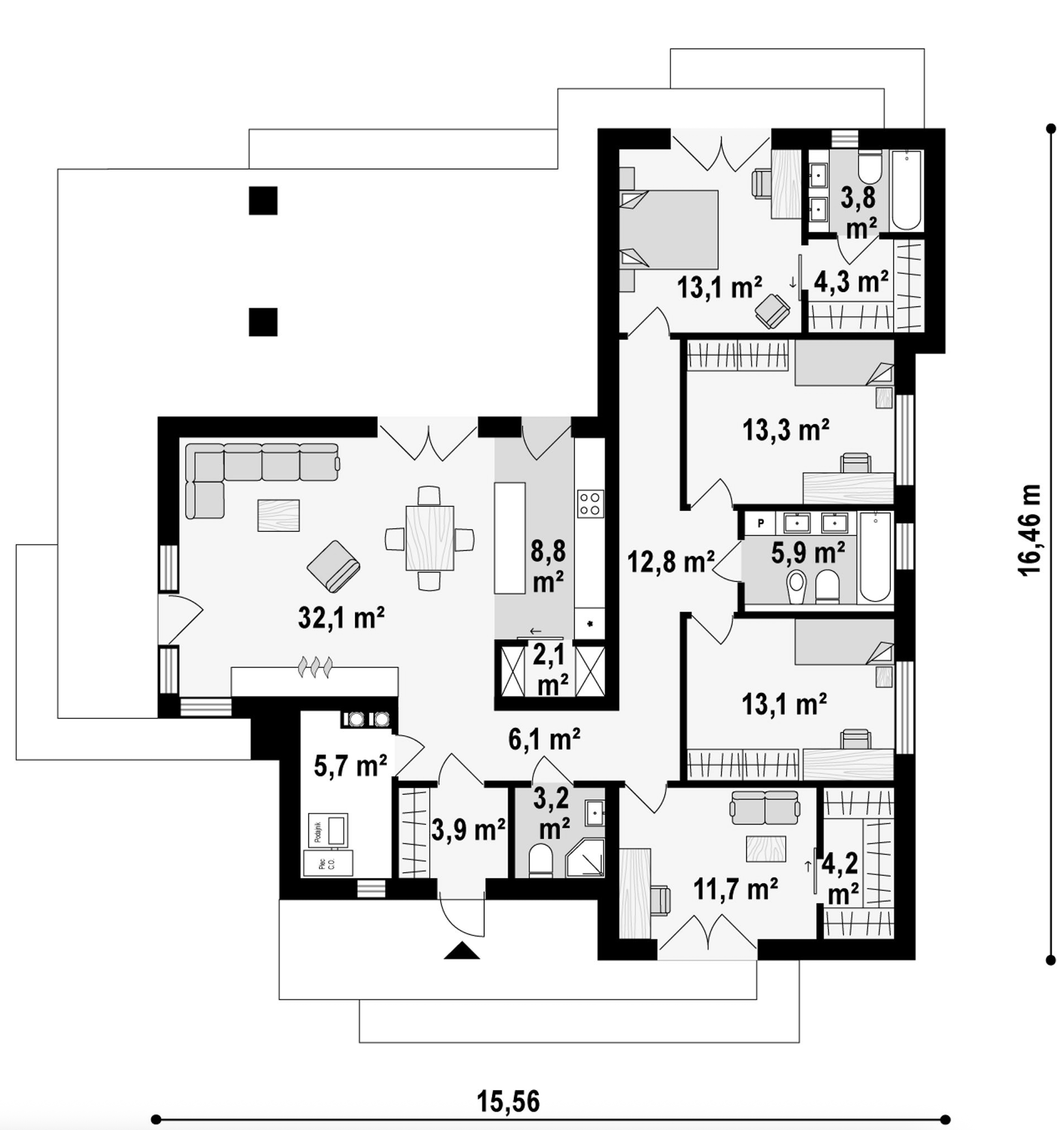 Maja mõõtmed 16.46 x 15.56 m