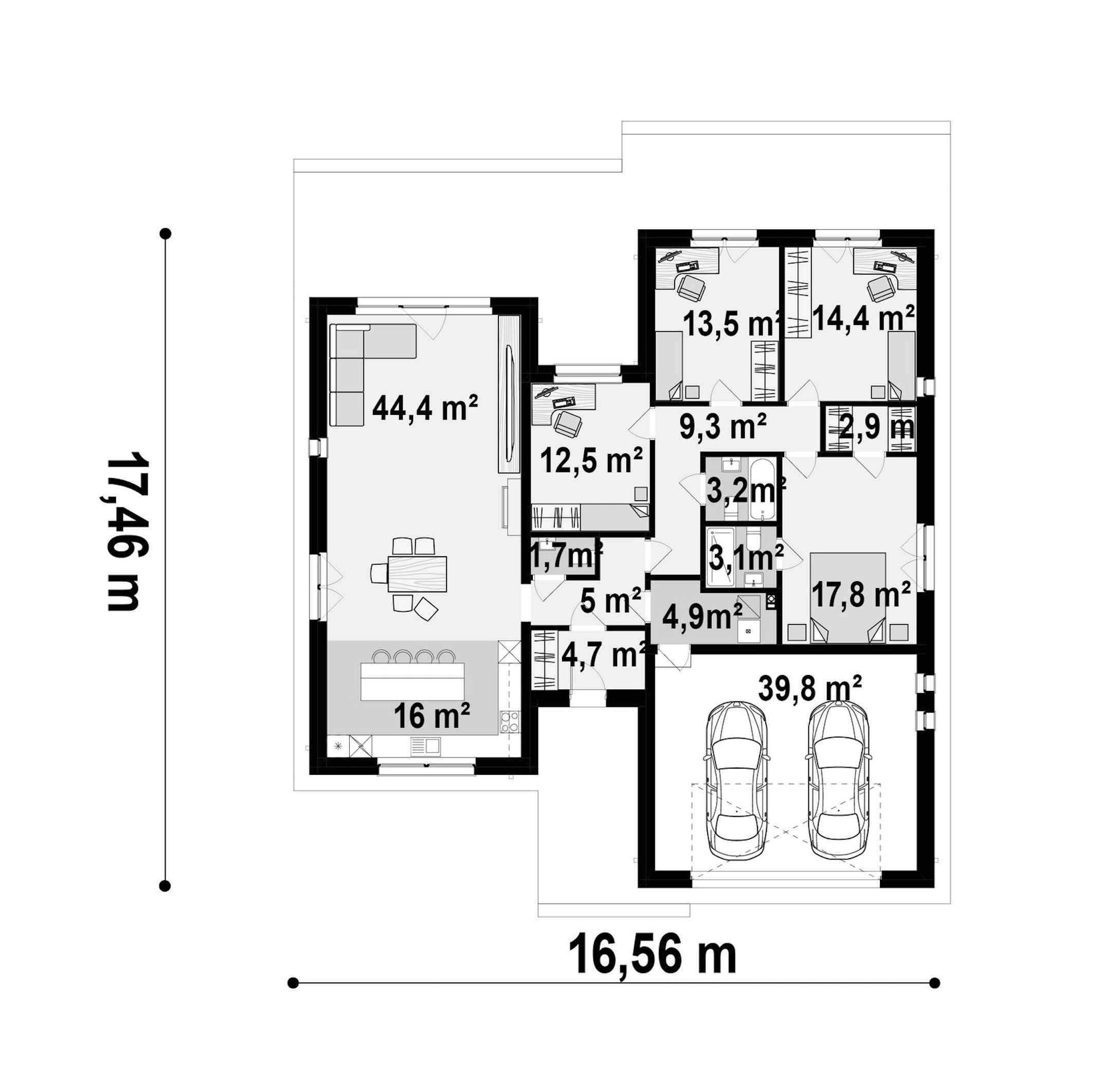 Maja mõõtmed 17.46 x 16.56 m